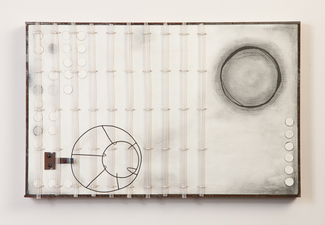 Capturing nitrogen 2011, 14 x 22 x 7 inches; wire, sheet metal, plastic vaccum tubing, paper, wood, graphite