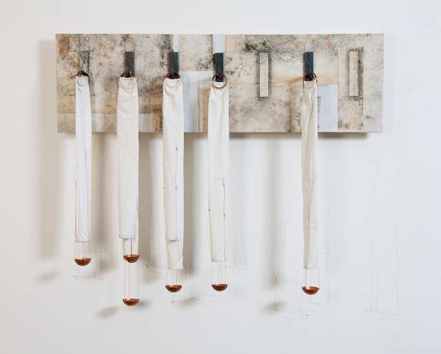 Interruption of the Moirai, a dangerous precedent installation 2013, 40 x 50 x 8 inches; sewn fabric tubes, string, handmade copper bowls, forged iron brackets, wood panel with pigmented fabric, graphite drawing directly on the wall.