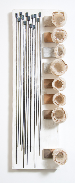 Our eyes had them fixed in a formulated phrase (13 parts, with T.S. Eliot in mind) 2013, 48.5 x 16 x 9 inches, plaster on wood, forged iron, encaustic, abaca paper (from the Protozoan Clan)