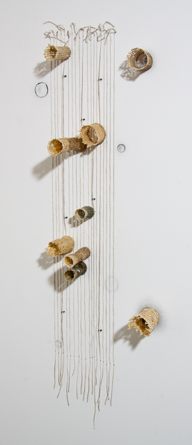 Radiolarian episode Installation, 2011, 55 x 22 x 7 inches; string nailed to the wall, fabric and beeswax tubes pinned to the wall with the tips of sewing pins, tiny steel blocks propping the strings off the wall, graphite drawing on the wall.