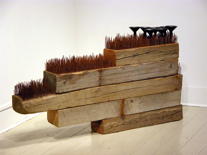 2004 60" x 8" x 31" forged and fabricated iron funnels, steel pins, salvaged wood